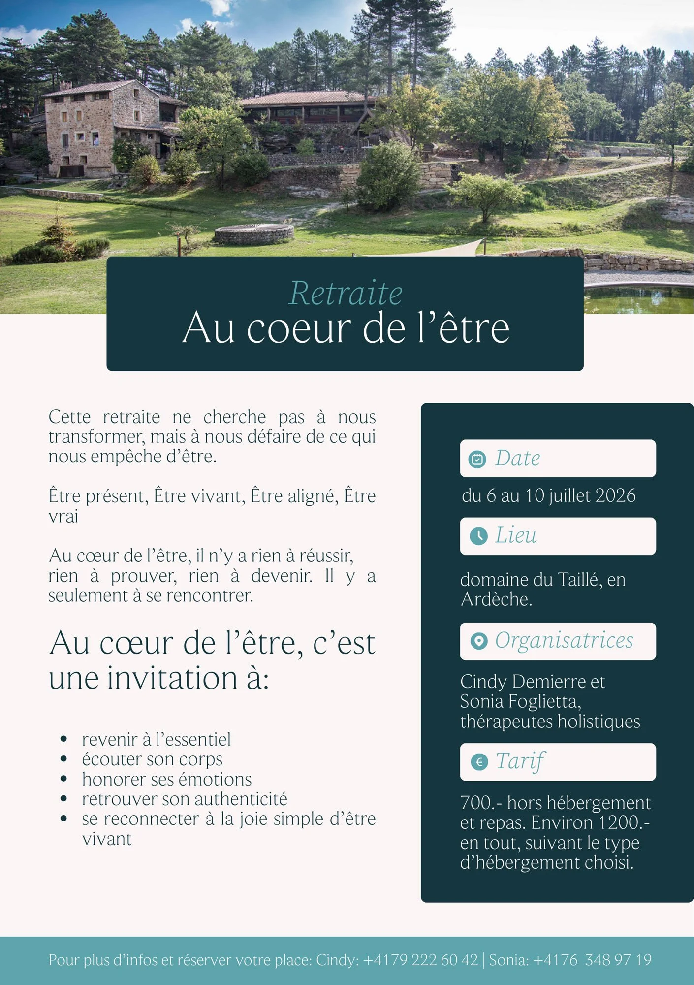 Retour à tous les événements Retraite au cœur de l’être lundi, 6 juillet 2026 08:00 vendredi, 10 juillet 2026 19:00 Vesseaux, Auvergne-Rhône-Alpes, 07200 France (carte) Google Agenda ICS Réserver ma place